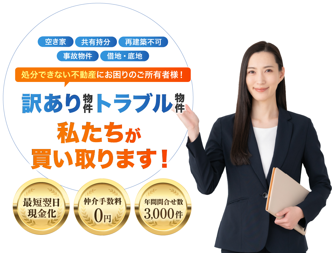 放置された空き家や事故物件、再建築不可等の訳アリ物件も積極的にお買取りさせていただきます。当社は、迅速かつ公平な価格での不動産買取をお約束します。お客様のご事情やニーズに合わせて、最適な解決策をご提案いたします。